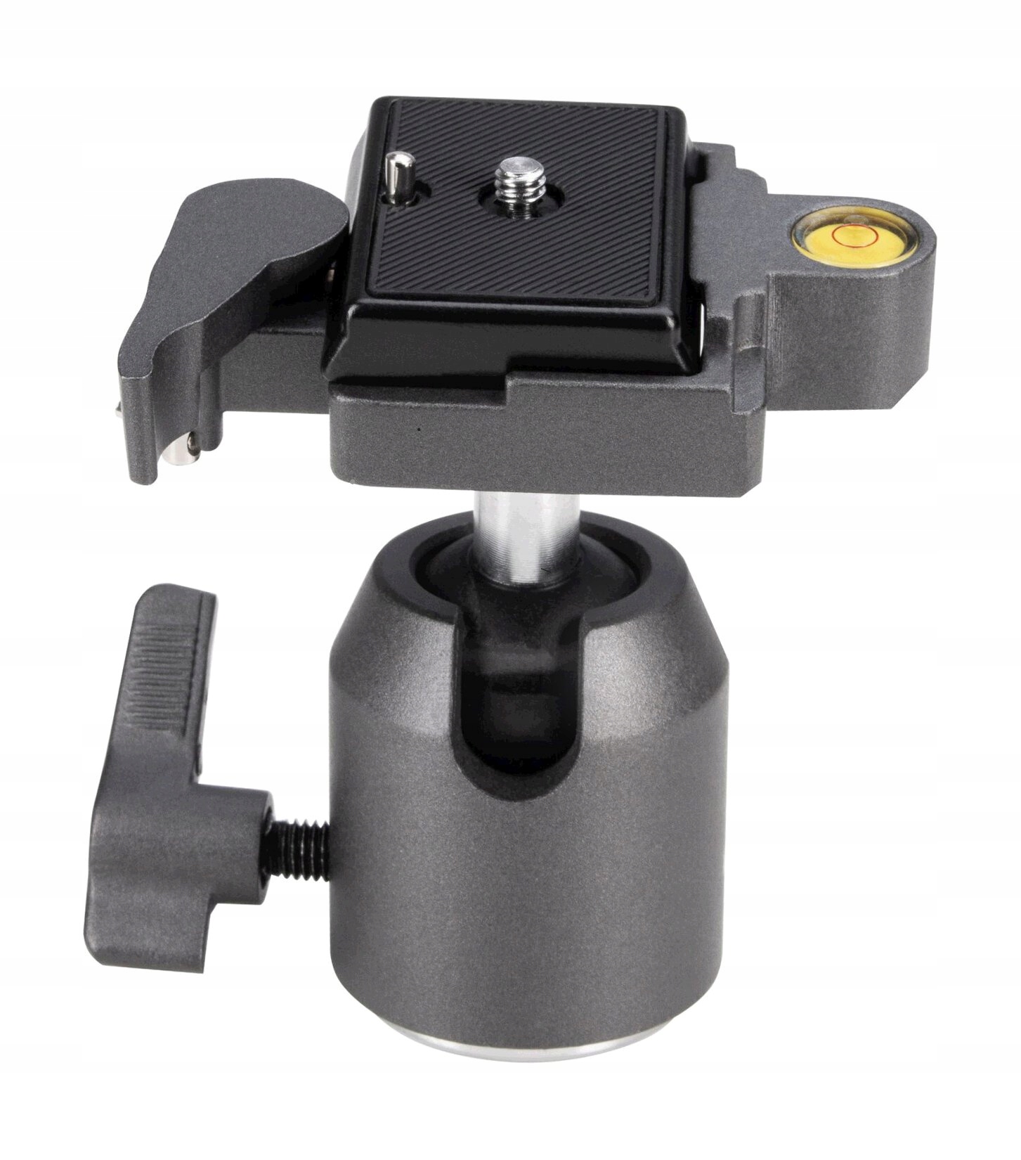 Głowica kulowa H020 z szybkozłączką, podwójną blokadą zapobiegającą wypięciu oraz wbudowaną poziomicą.