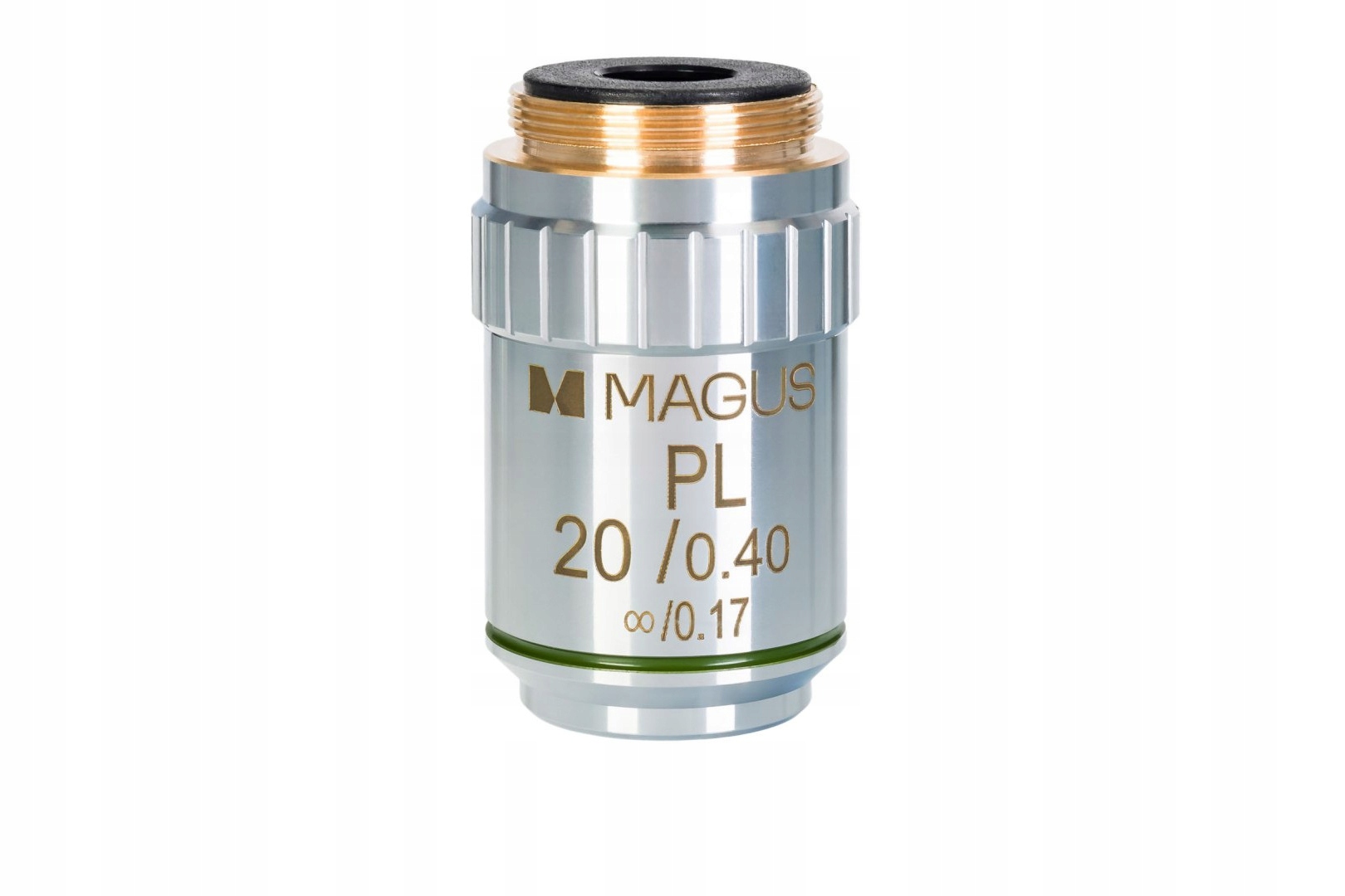 Obiektyw MAGUS MA20 20x/0,40 ma korekcję chromatyczną dla koloru niebieskiego i czerwonego oraz korekcję aberracji sferycznej dla koloru zielonego. Krzywizna pola jest korygowana dla 90% średnicy pola widzenia. Zaleca się używanie obiektywu z okularami o powiększeniu od 10x do 20x. Grubość szkiełka nakrywkowego do obserwacji z tym obiektywem wynosi 0,17 mm.