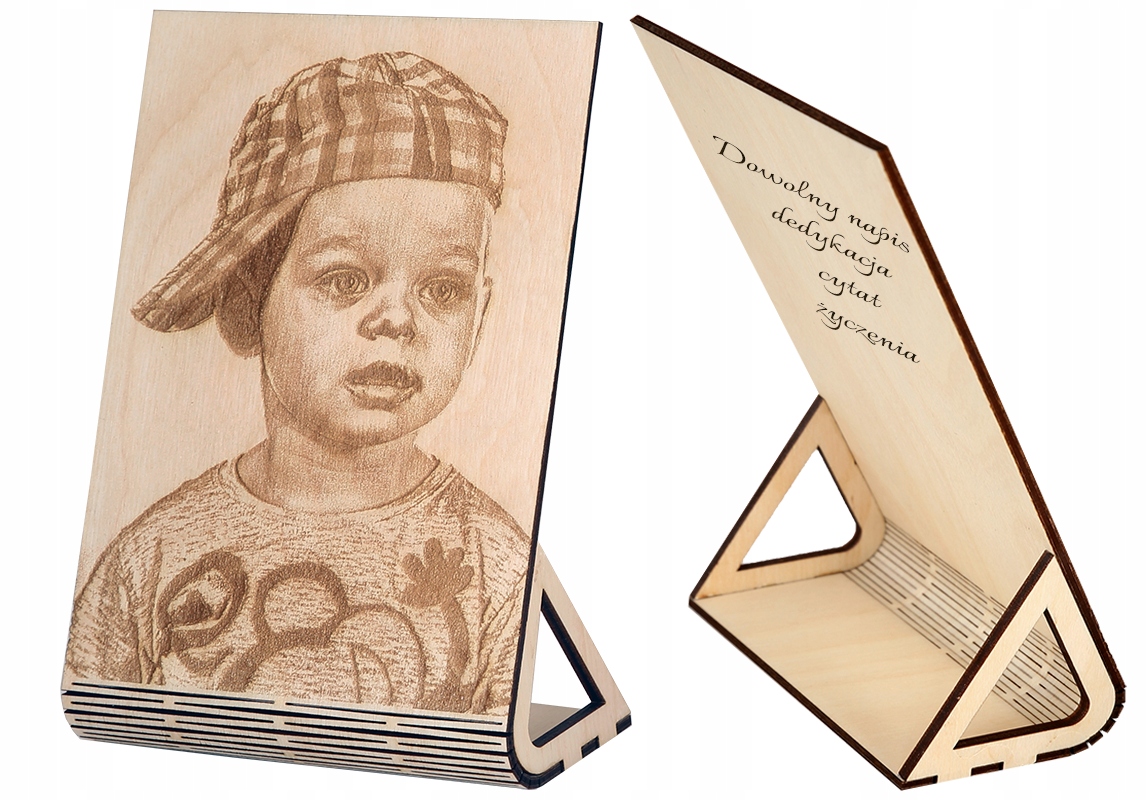 Zdjęcie grawerowane laserowo na drewnianej ramce wymiar 20 x 30 cm z napisem z tyłu (pion lub poziom) do postawienia.