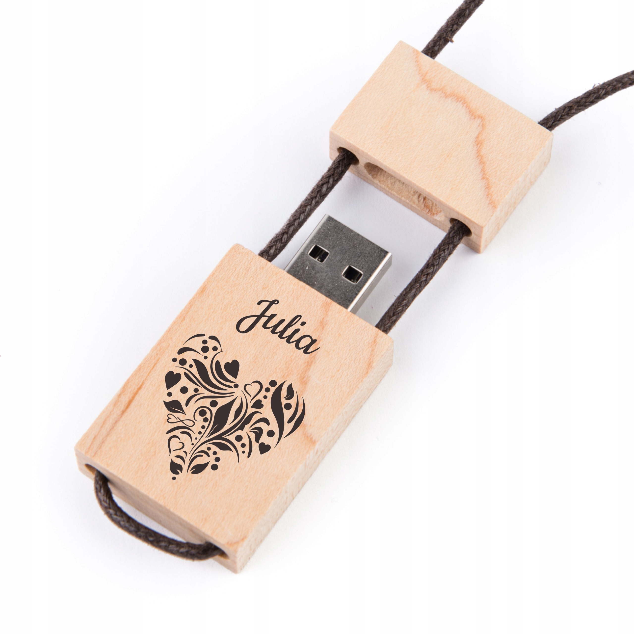 Pendrive Drewniany z Sznurkiem – Jasny / Klon o pojemności 2 GB, USB 2.0 + Grawerem z imieniem