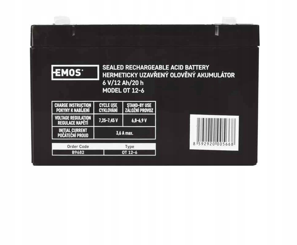 Akumulator B9682 producenta EMOS, stosuje się, jako rezerwowe źródło zasilania do urządzeń zasilania rezerwowego UPS, zestawów RBC, samochodzików dla dzieci, itp.Bezobsługowy akumulator ołowiowy z zaworami regulacyjnymi w wykonaniu AGM umożliwiającym użytkowanie go w dowolnym położeniu. Jest odporny na niekorzystne czynniki zewnętrzne i ma długi proces samorozładowania. Optymalna żywotność w systemach zasilania rezerwowego wynosi 5 lat. Produkt objęty gwarancją producenta.