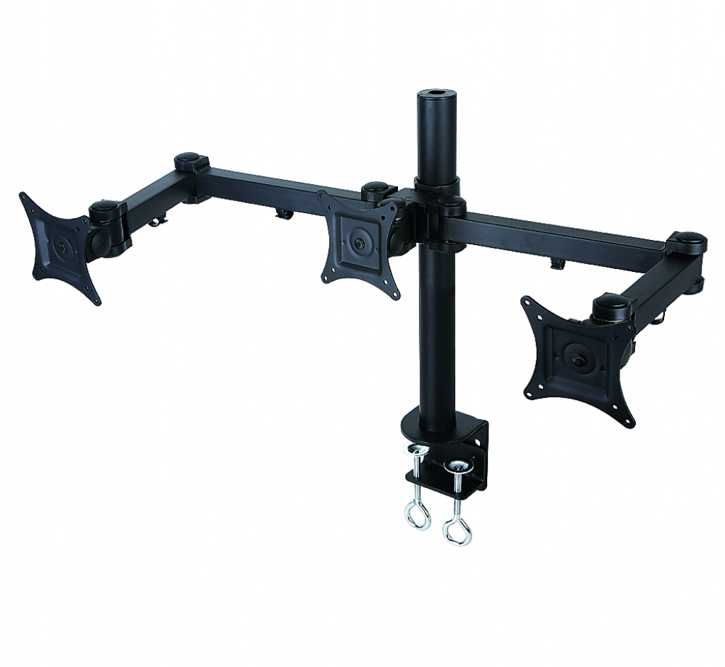 Uchwyt biurkowy do trzech monitorów LCD. Rozmiary monitorów to 13 – 20 cali. Maksymalna waga monitora to 6 kg. Uchwyt wykonany ze stali, miedzi i aluminium. Standard VESA to 75 x 75 mm i 100 x 100 mm.
