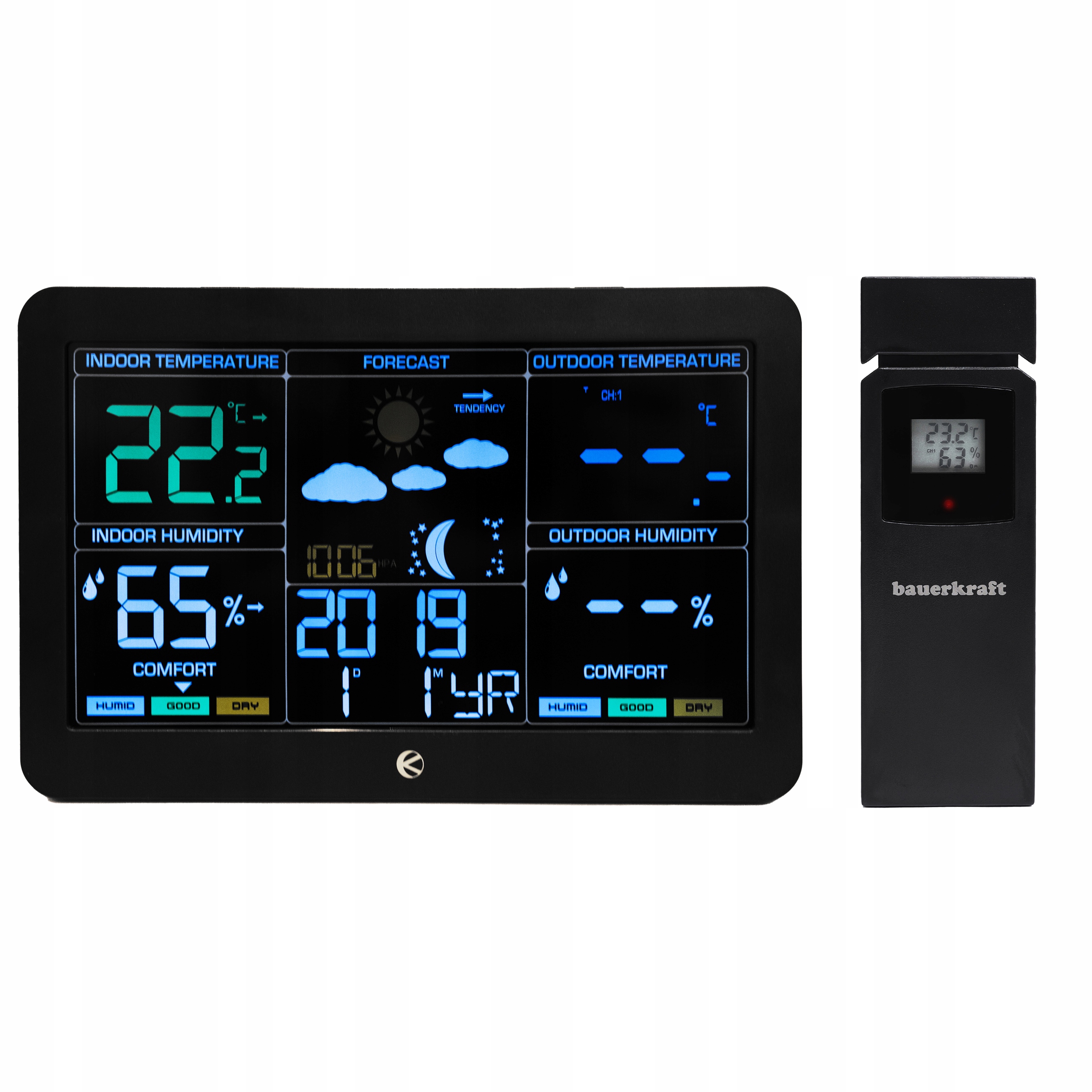 Bezprzewodowa stacja pogodowa to wielofunkcyjne urządzenie przydatne w każdym domu. Stacja wykonuje pomiar takich wartości jak: temperatura czy wilgotność, a dodatkowo posiada funkcję zegar, budzik z funkcją drzemki, fazy księżyca, prognoza pogody na najbliższe 12-24h oraz kalendarz. Urządzenie posiada w zestawie czujnik zewnętrzny z zasięgiem 30 metrów, dzięki któremu możliwy jest pomiar zarówno w pomieszczeniu, jak i na zewnątrz budynku. Podane wartości są aktualizowane na bieżąco.