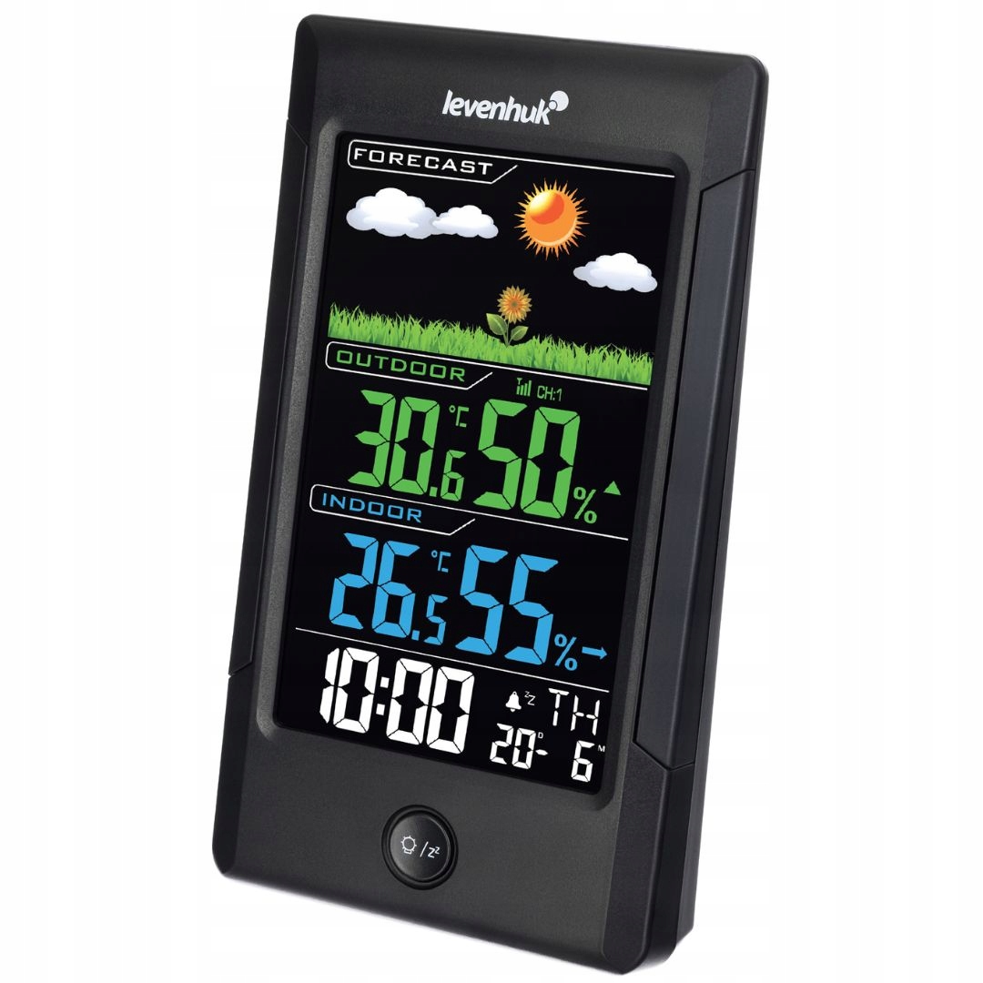 Termohigrometr Levenhuk Wezzer Teo TH40 to stylowy gadżet do użytku domowego lub biurowego. Urządzenie ma kontrastujący kolorowy ekran z podświetleniem i jest wyposażone w bezprzewodowy czujnik temperatury i wilgotności, który można umieścić w odległości do 80 metrów od modułu głównego. Oprócz pomiaru temperatury i wilgotności urządzenie wyświetla również godzinę, datę, dzień tygodnia, trendy pogodowe i prognozę pogody. Dostępna jest również funkcja budzika z opcją drzemki.