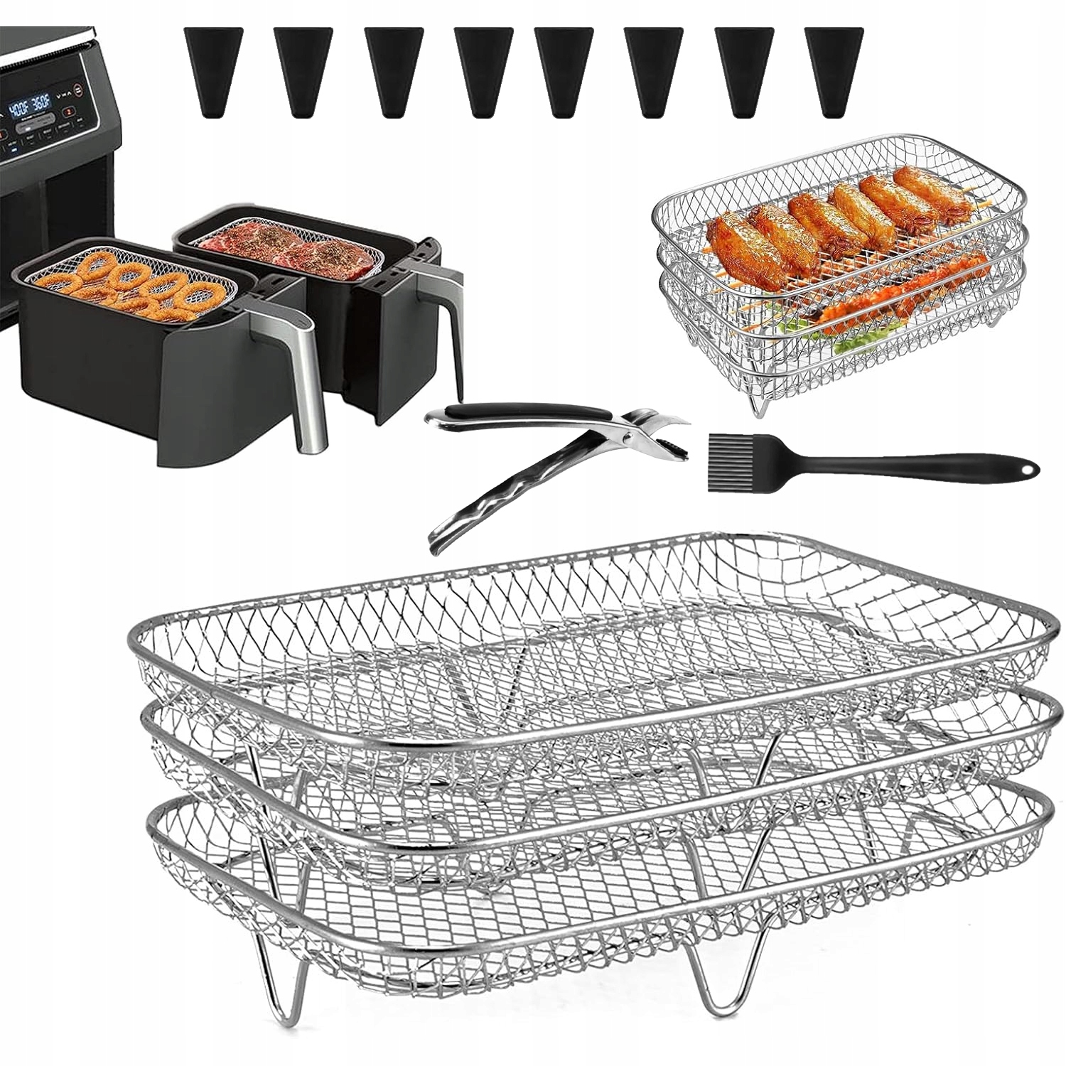 Ten zestaw akcesoriów do frytkownicy powietrznej zawiera 3 koszyki ze stali nierdzewnej, 1 silikonową szczotkę, 1 klips ze stali nierdzewnej i 8 silikonowych podkładek. Znajdziesz tu wszystko, czego potrzebujesz, żeby wypróbować różne techniki kulinarne i przepisy.