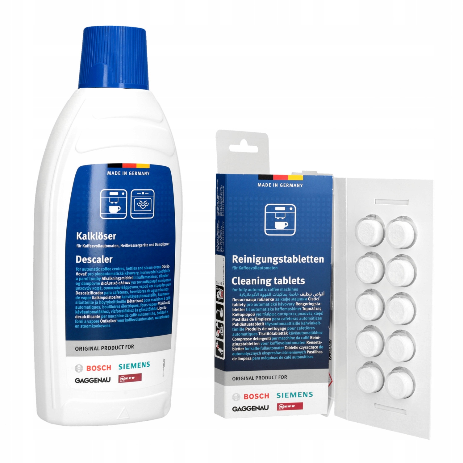 Zestaw umożliwia kompletne wyczyszczenie oraz prawidłową konserwację ekspresu. Produkty skutecznie oczyszczają części ekspresu. Zestaw dokładnie eliminuje pozostałości kawy, mleka oraz tłuszczu. Zapobiega osadzaniu się tłustych zanieczyszczeń. Zestaw konserwujący niweluje rozwój drobnoustrojów, pleśni i kamienia. Preparaty znacznie polepszą jakość i smak przyrządzanej kawy. Producentem produktów jest Bosch
