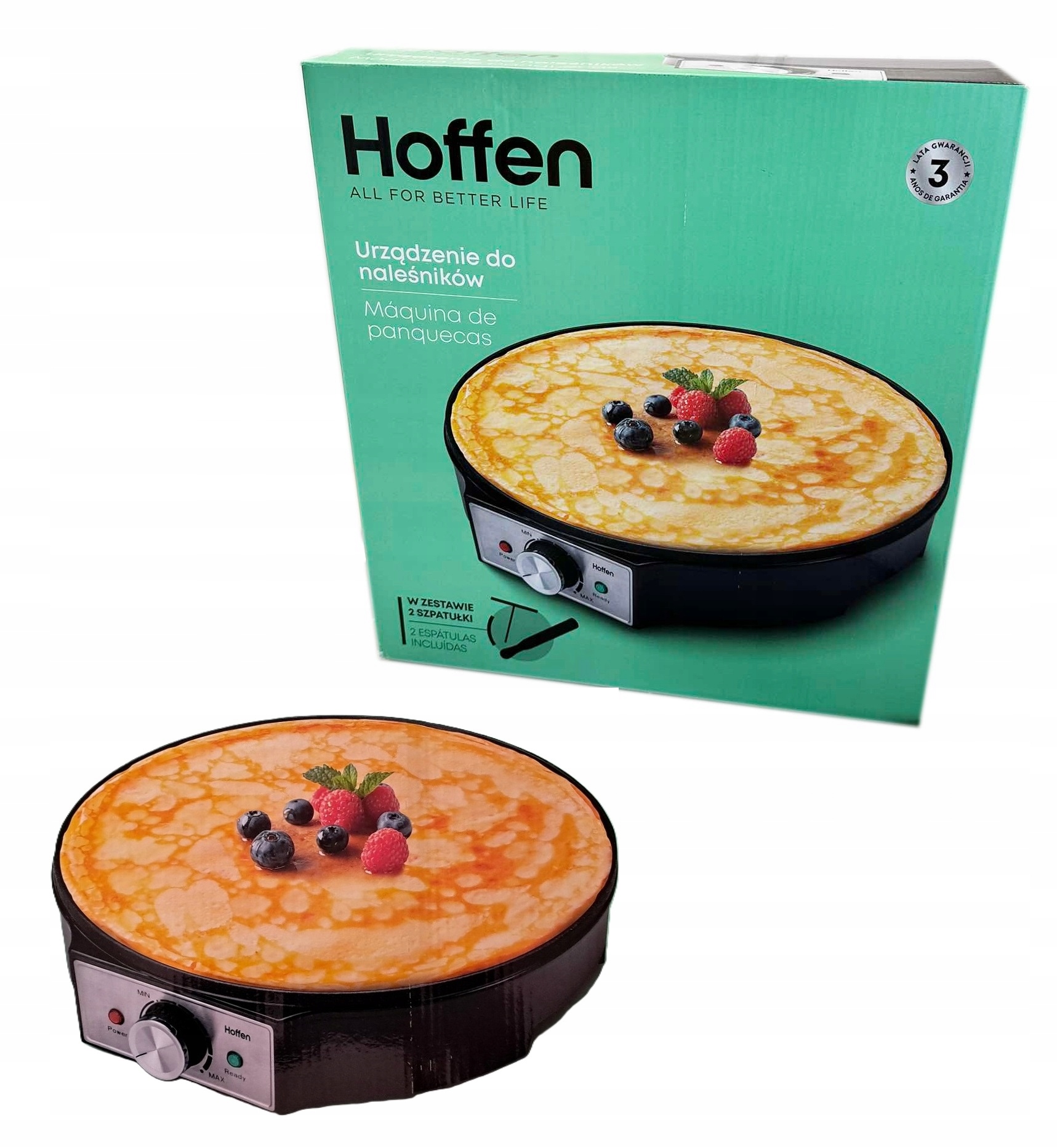Urządzenie do naleśników marki Hoffen o mocy 1000 W pomoże przygotować doskonałe placki szybko i bardzo łatwo, bez obaw o przywieranie ciasta, czy nierównomierne wysmażenie.