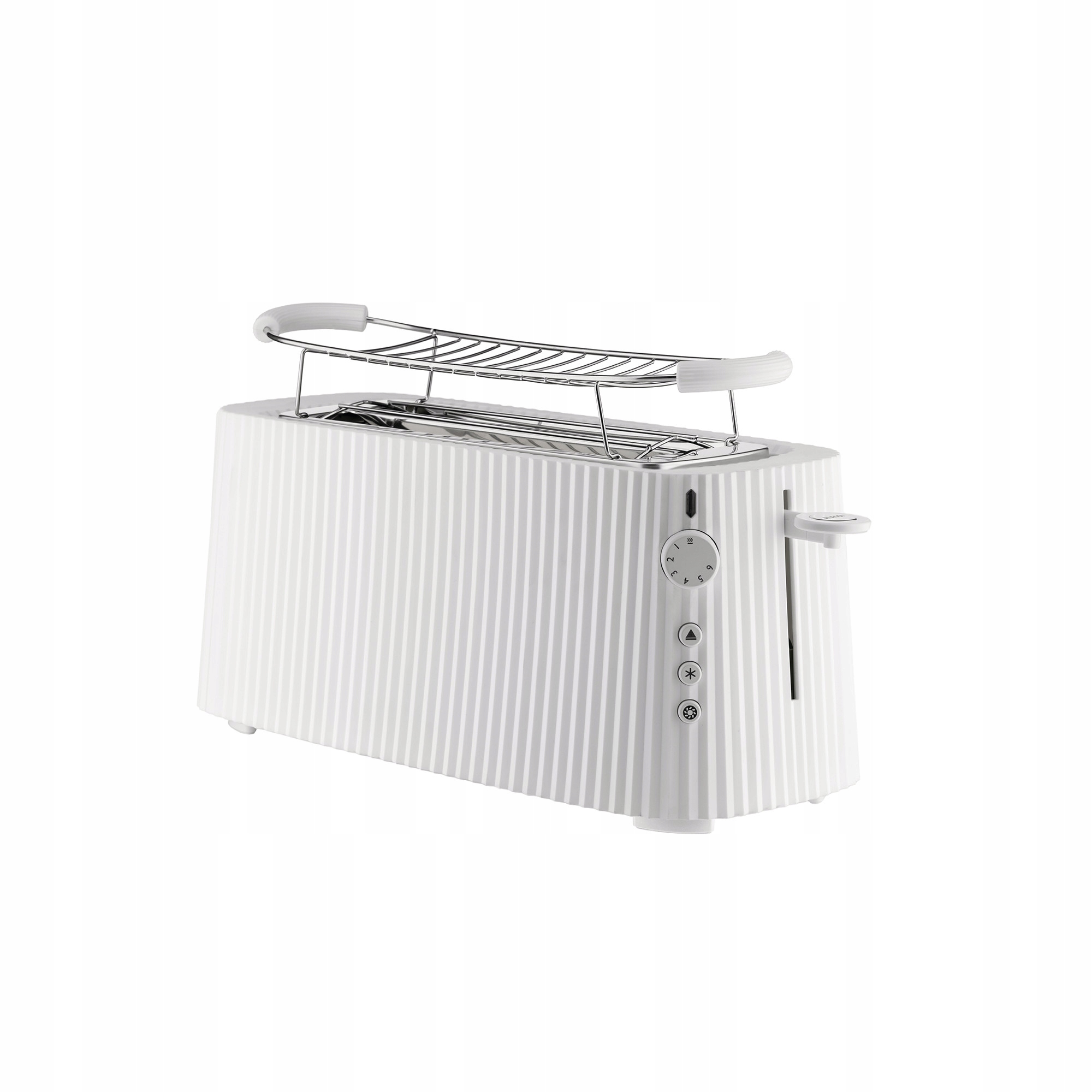 Toster marki Alessi z kolekcji Plissé przekonuje wysoką funkcjonalnością i niepowtarzalnym wyglądem. Dzięki sześciu stopniom opiekania i zintegrowanej funkcji zatrzymywania, rozmrażania i podgrzewania każdy kawałek tostu stanie się indywidualną przyjemnością. Z drugiej strony funkcja bajgla podgrzewa tylko jedną stronę tostu. Ponadto podstawa urządzenia jest antypoślizgowa, a wysuwana tacka na okruchy ułatwia czyszczenie. Podgrzewacz brioche może być używany do utrzymywania ciepła tostowych kromek chleba lub do podgrzewania rogalików, pizzy lub innych wypieków. Aby zapobiec plątaniu się kabla, zintegrowany kabel można owinąć wokół dolnej podstawy tostera. Obudowa jest – charakterystyczna dla kolekcji Plissé – ozdobiona pionowymi nacięciami, co zapewnia elegancki wygląd i przyciąga wzrok na każdej zabudowie kuchennej. Obiekt projektowy został stworzony przez Michele De Lucchi. Toster składa się z termoplastycznej obudowy i wewnętrznych elementów ze stali nierdzewnej. Wymiary wersji XXL: wysokość 25 cm, szerokość 46.5 cm, głębokość 18.5 cm, przewód 100 cm, moc 1700 Watt.