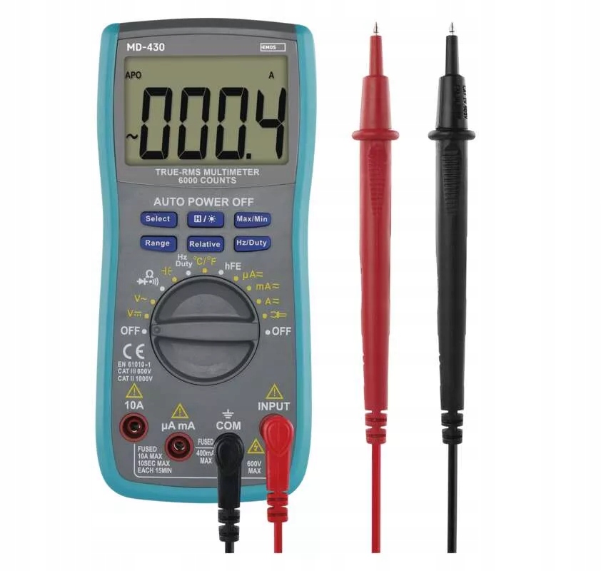 Zaawansowany multimetr M0430 przeznaczony jest do celów profesjonalnych oraz do użytkowania przez hobbystów.Można go wykorzystać do zarówno przy konserwacji urządzeń elektrycznych, jak i wykonywaniu nowych instalacji elektrycznych. Przyrząd oferuje wszystkie standardowe funkcje pomiarów za pośrednictwem grotów, umożliwia zarejestrowanie pomiarów w celu przeprowadzenia ich oceny oraz zapewnia wiele innych zaawansowanych funkcji . Duży zakres pomiarów prądu i napięcia AC/DC sprawia, że ten multimetr jest prawdziwie uniwersalnym narzędziem. Dzięki funkcji True RMS, przyrząd umożliwia dokładny pomiar wartości dowolnych przemiennych sygnałów niesinusoidalnych natężenia i napięcia. Ponadto, podczas ustawiania zakresu pomiarów pozwala skorzystać z ręcznego lub automatycznego sposobu wyboru zakresu. Dodatkowo multimetr posiada podświetlany wyświetlacz, sygnalizację akustyczną. Największą zaletą tego multimetru są funkcje zaawansowane – pomiar ciągłości obwodu, test diod i tranzystorów, a także pomiar temperatury w zakresie -40 °C do +300 °C dzięki dostarczanej w ramach standardowego wyposażenia sondzie temperaturowej typu K .Funkcja data hold służy do rejestracji wyświetlanych aktualnych wyników pomiarów w celu ich późniejszej oceny. Multimetr rejestruje maksymalne i minimalne zmierzone wartości. Dziękitaśmie do zawieszania z magnesem można przyrząd przymocować do dowolnego metalowego podłoża i mieć go stale pod ręką. Zestaw zawiera: groty pomiarowe, redukcję do pomiarów tranzystorów, sondę temperaturową typu K i baterię 9 V.