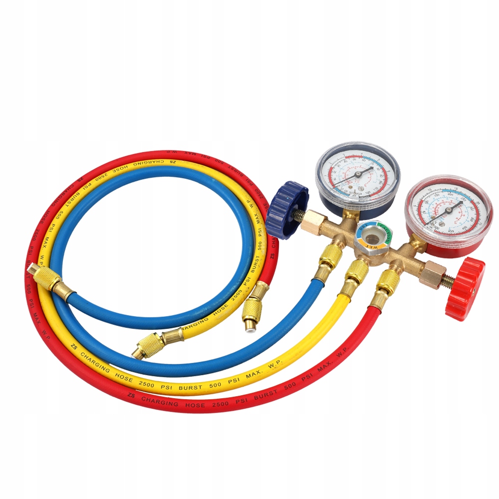 5. W zestawie hak i 3 węże (czerwony, niebieski i żóty). Kolektor jest dwukierunkowy i wykonany z mosiądzu.