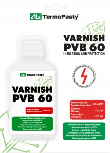Lakier PVB 60 firmy AG Termopasty to uniwersalny lakier do płytek drukowanych. Pokryta nim powierzchnia po szybkim wyschnięciu wykazuje dobre właściwości izolacyjne. Zadaniem lakieru jest przede wszystkim zabezpieczenie przed wystąpieniem korozji oraz powstawaniem prądów błądzących i zwarć. Pozwala uszczelnić plastikowe obudowy wtyczek i gniazdek. Przydaje się również przy tworzeniu warstw ochronnych w energetyce i elektromechanice. Należy pamiętać, że uniwersalny lakier PVB 60 można stosować w zakresie temperatur od -40 do 60 stopni Celsjusza.