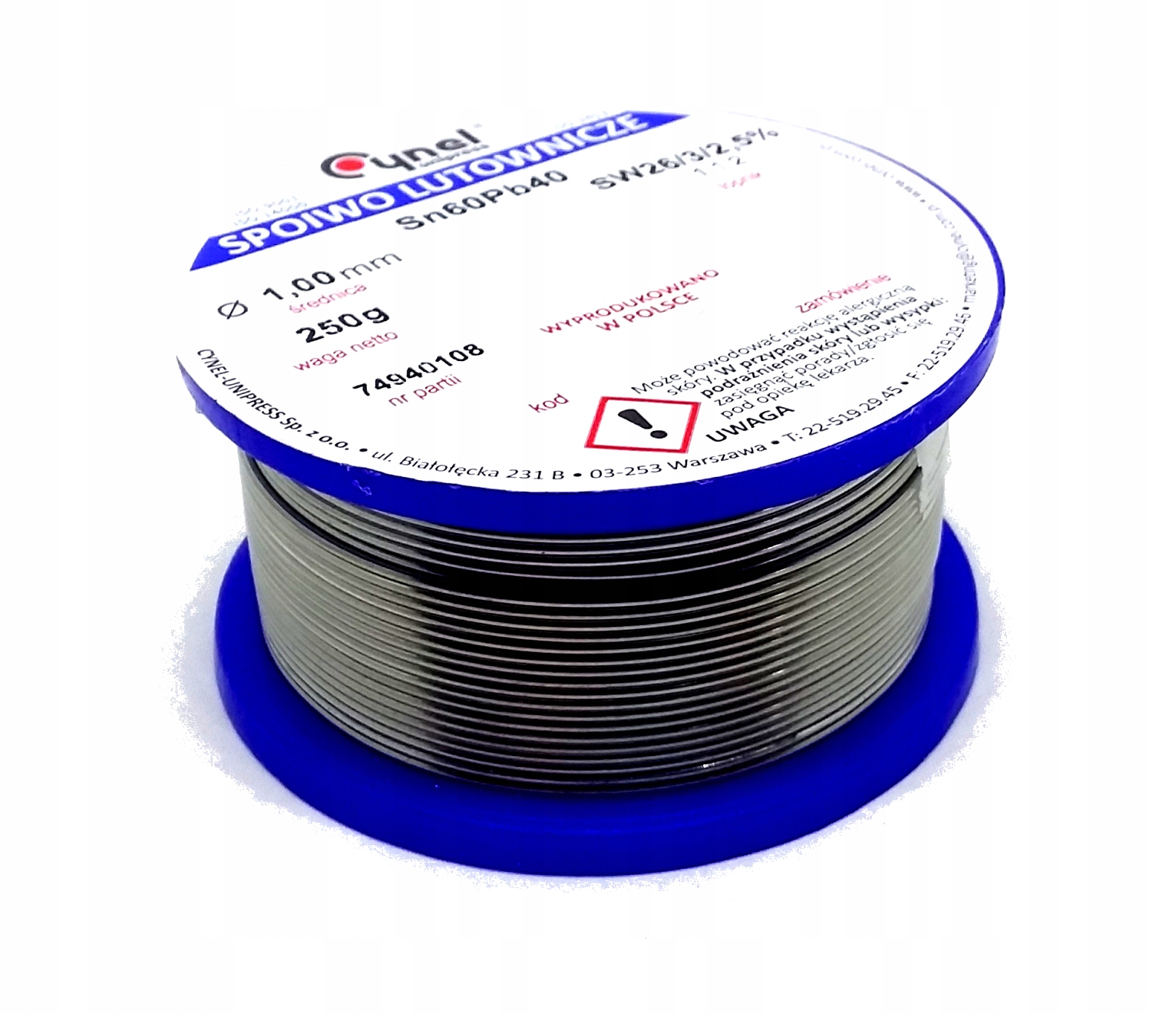 Wysokiej jakości cyna z topnikiem Sn60Pb40 w opakowaniach o wadze 250 gram.