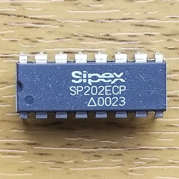 Układ SP202ECP produkcji Sipex – podwójny konwerter RS-232 – TTL, zasilanie 5V, zabezpieczenia ESD 15kV, obudowa DIP-16.