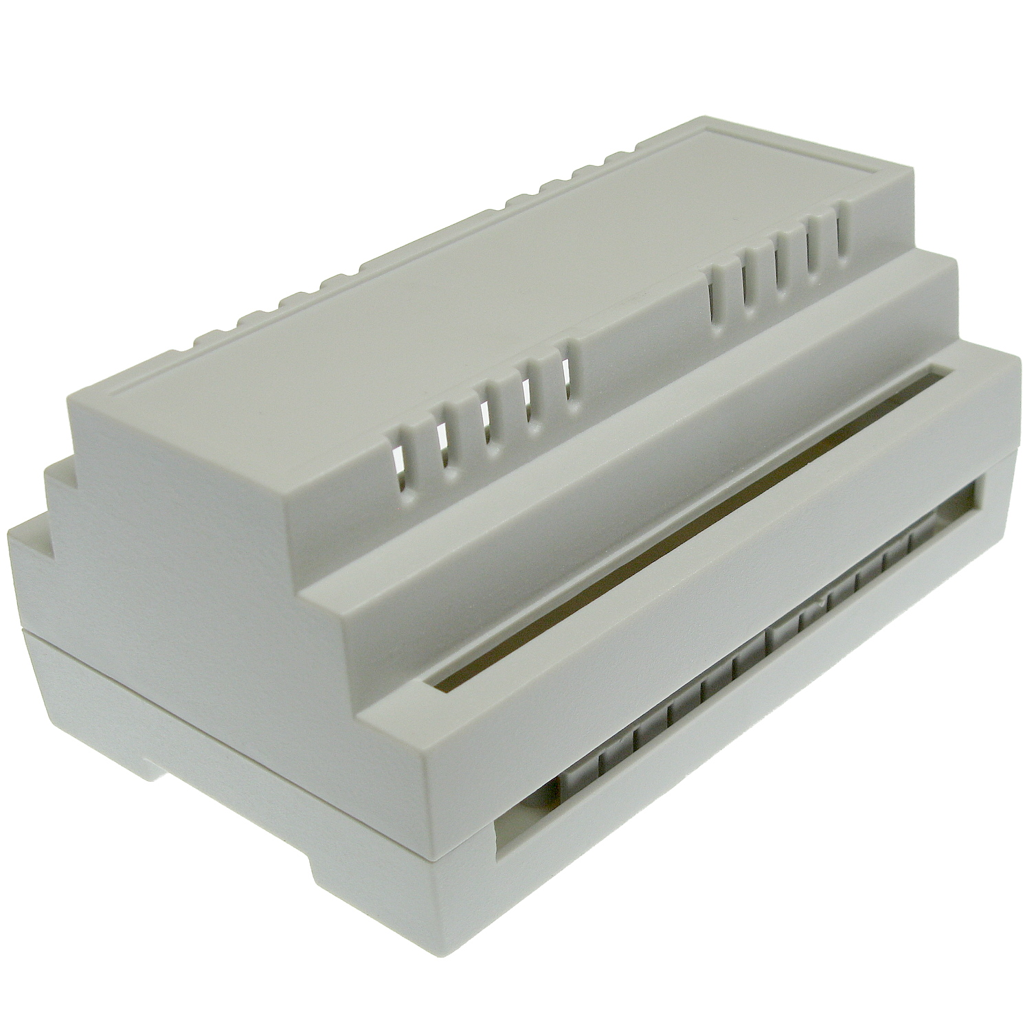 Obudowa mocowana na szynę DIN, składa się z dwóch części: dolnej i górnej. Łączenie tych pokryw odbywa się przy pomocy czterech wkrętów w narożnikach obudowy. Obudowa posiada otwory wentylacyjne w górnej pokrywie a także otwory do przyłączenia przewodów.