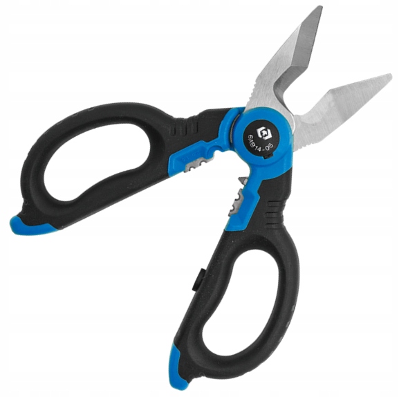 Profesjonalne nożyczki ze specjalną stalową ramą o dużej odporności mechanicznej i wysokiej trwałości. Nożyczki służące do cięcia kabli oraz przewodów elektrycznych. Ząbkowane ostrze wykonane zostało ze stali nierdzewnej 4034 co zapewnia czyste cięcie. Dodatkowym atutem nożyczek jest specjalne zagłębienie pozwalające na ściąganie izolacji oraz zapobiegające wyślizgiwaniu się kabla w trakcie cięcia. Rękojeść wykonana z lekkiego i mocnego tworzywa sztucznego PP + TPR odpornego na uderzenia. Ergonomicznie zaprojektowane uchwyty zapewniają wygodny chwyt co przekłada się na efektywność pracy. Nożyczki wyposażone w plastikową osłonę zabezpieczającą ostrze oraz klips pozwalający na zaczepienie nożyczek na pasku.