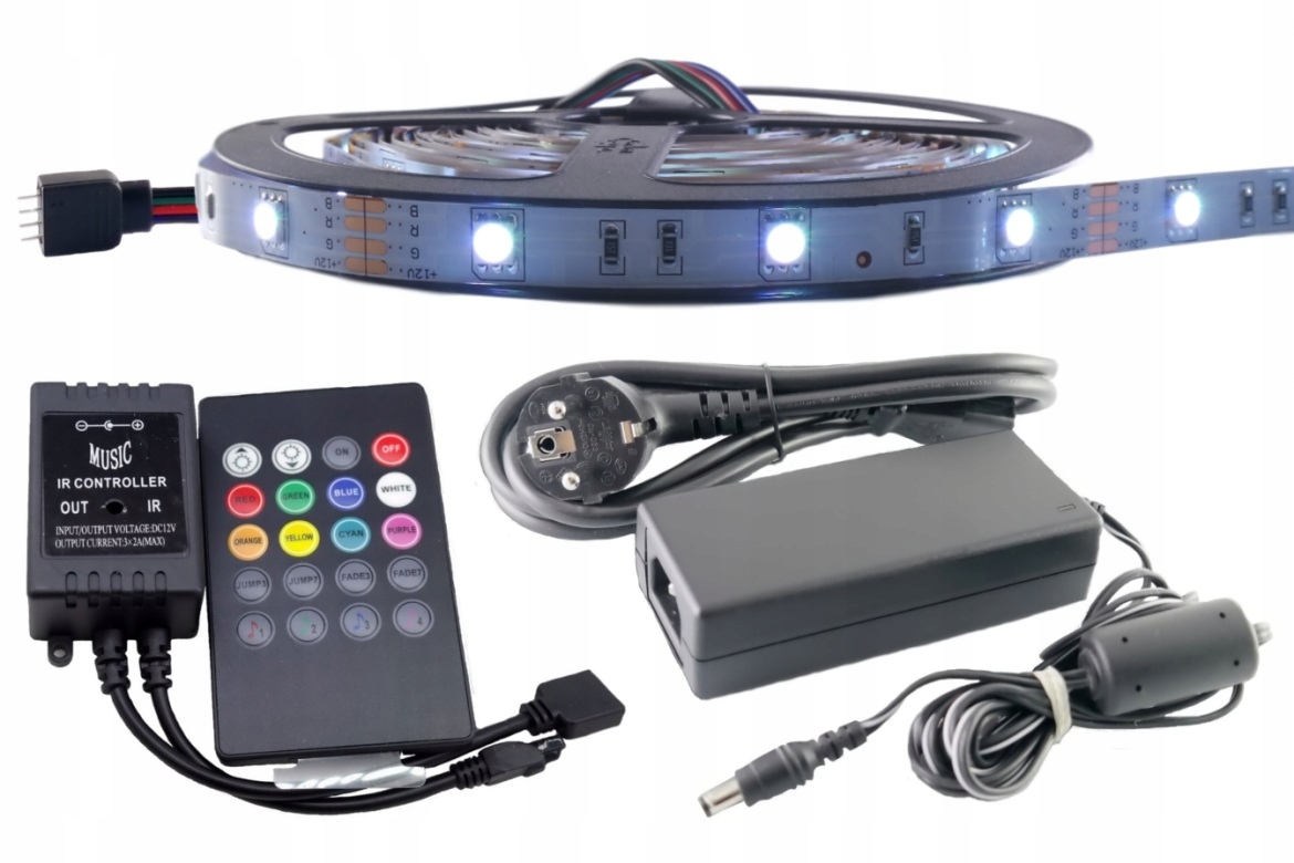 ZESTAW Taśma LED RGB 5050 EPISTAR 3-chip 30LED/m SMD IP20 7,2 W/m elastyczna kolorowa sterownik MUZYCZNY 5m