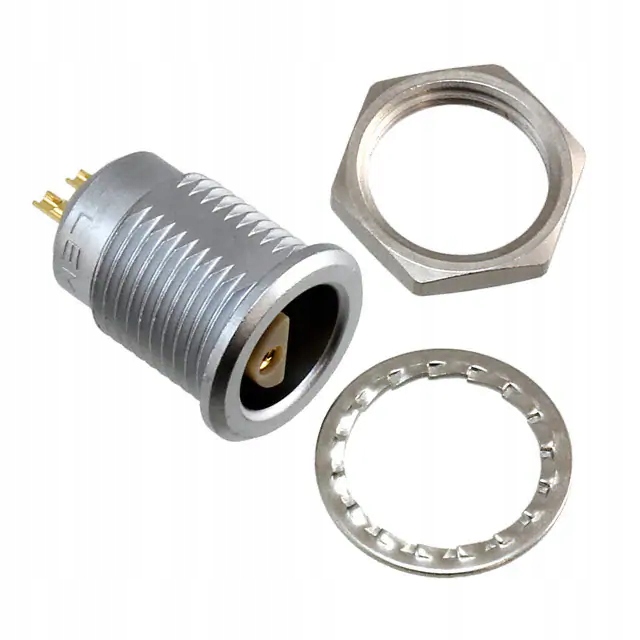Gniazdo panelowe serii S. Ilość pinów 2 żeński+męski lutowane. Sposób montowania – nakrętka od strony urządzenia. Kodowanie za pomocą izolatora-pół księżyc. Materiał obudowy – mosiądz chromowany.