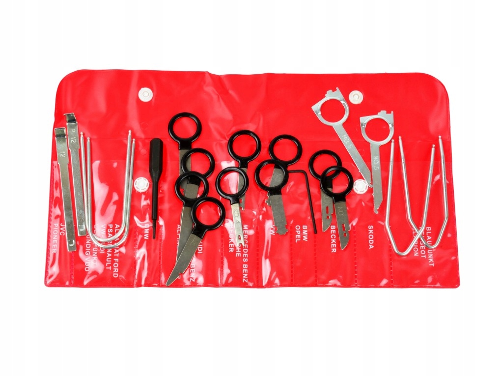 20-elementowy uniwersalny zestaw do demontażu radia i nawigacji. Zestaw umożliwia demontaż praktycznie każdego radia samochodowego. Niezastąpiony w serwisach zajmujących się nagłośnieniem CAR-audio.