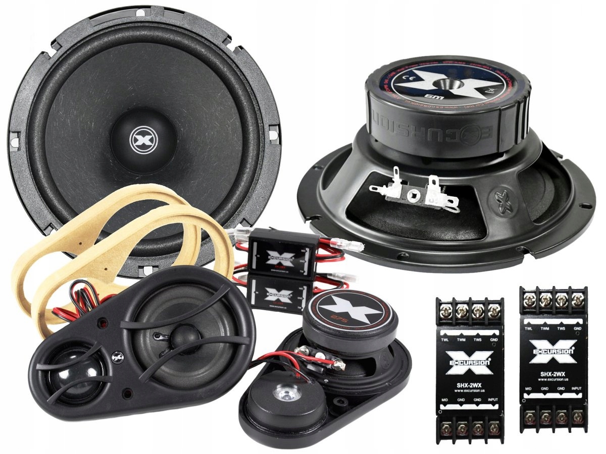 Samochodowy 3-drożny zestaw głośników odseparowanych z wooferami o średnicy 165 mm marki Excursion z serii SHX (Street High Power eXcursion). W skład zestawu wchodzą 2 głośniki niskotonowe SHX-6M, 4 zwrotnice pasywne oraz zestaw średnio-wysokotonowy SX-SAT (2 głośniki wysokotonowe + 2 głośniki średniotonowe + panele montażowe z MDF). Głośniki z serii SHX, to bardziej zaawansowane brzmieniowo produkty o podwyższonej wydajności przeznaczone do uniwersalnych zastosowań oraz jako zamienniki fabrycznych systemów głośnikowych (OEM). W porównaniu do cieszących się bardzo dobrą opinią głośników z niższej serii SX, zestawy głośnikowe SHX prezentują znacznie dojrzalszy i bardziej dynamiczny charakter brzmienia. Wyższa moc wzmacniacza przeważnie zawsze zapewnia lepszą kontrolą głośników. Z tego powodu impedancja cewek wooferów SHX-6M została obniżona do 3 Ohm. Jest to jeszcze akceptowalna wartość przez większość standardowych radioodtwarzaczy i dobre systemy fabryczne. Dzięki temu można efektywniej wykorzystać każdy wzmacniacz, nawet wbudowany w radioodtwarzaczu, uzyskując z niego dodatkowo ok. 25% więcej mocy, co w praktyce przekłada się na bardziej dynamiczne brzmienie. Membrany wooferów wykonano z bardzo dobrego materiału, którym jest kompozyt papieru i naturalnej wełny wzmocniony domieszką włókna szklanego. Sprawia to, że membrany są lżejsze ok. 10%, co skutkuje wyższą detalicznością brzmienia w zakresie średnich tonów oraz odczuwalną poprawą szybkości ataku fundamentu basowego (po wstępnym okresie docierania). Natomiast większy o 25% wentylowany układ magnetyczny EFF (Efficient Flux Field) i wydłużona szczelina cewki umożliwiają większe liniowe wychylenia membrany, zapewniając wyższą wydajność głównie w zakresie niskich tonów. Stalowe kosze wooferów oraz aluminiowe karkasy cewek zostały wyposażone w dodatkowe otwory wspomagające system chłodzenia. Membrany wooferów SHX-6M mają specjalnie ukształtowane nakładki przeciwpyłkowe (dustcap) w stylu korektorów fazy, których głównym zadaniem jest poprawa rozdzielczości brzmienia w przypadku większego kąta odsłuchu (np. przy nisko zamontowanych wooferach). Za wyższy zakres pasma akustycznego odpowiada zintegrowany zestaw naturalnie i detalicznie brzmiących głośników średnio-wysokotonowych SX-SAT. Membrany przetworników średniotonowych wykonano z 2-warstwowego prasowanego papieru, a głośniki wysokotonowe to wysokiej jakości 25-milimetrowe kopułk z naturalnego jedwabiu. Bliska lokalizacja względem siebie obu przetworników znacznie poprawia wrażenia brzmieniowe i ułatwia prawidłowe zestrojenie sekcji średnio-wysokotonowej w systemach 3-drożnych. W komplecie znajdują się także zwrotnice pasywne 6 dB/okt., do których budowy użyto wysokiej jakości kondensatorów audio MKP (HPF) oraz cewek z grubego miedzianego drutu (LPF).