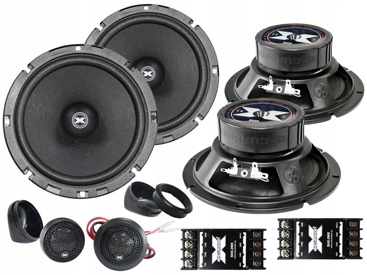 Samochodowy 2-drożny zestaw głośników odseparowanych marki Excursion z serii SHX (Street High Power eXcursion) zawierający 4 mid-woofery o średnicy 165 mm. Zestawy głośnikowe SHX w wersji w wersji dB (double Bass) z podwójnymi mid-wooferami to bardziej zaawansowane brzmieniowo produkty o podwyższonej efektywności przeznaczone dla użytkowników oczekujących ponadprzeciętnie mocnych wrażeń w zakresie basu. W porównaniu do cieszących się bardzo dobrą opinią głośników z niższej serii SX, zestawy głośnikowe SHX prezentują znacznie dojrzalszy i bardziej dynamiczny charakter brzmienia. Wyższa moc wzmacniacza przeważnie zawsze zapewnia lepszą kontrolą głośników. Z tego powodu impedancja cewek mid-wooferów SHX została obniżona do 3 Ohm. Dzięki temu przy równoległym połączeniu dwóch mid-wooferów w jednym kanale (wypadkowa impedancja 1,5 Ohm) można bardzo efektywnie wykorzystać wzmacniacz, uzyskując z niego dodatkowo nawet do 50-75% więcej mocy. Wzmacniacze Excursion stabilne do 2 Ohm bardzo dobrze radzą sobie z impedancją 1,5 Ohm i bezproblemowo współpracują z zestawami głośnikowymi SHX-6C dB. Membrany mid-wooferów wykonano z bardzo dobrego kompozytu papieru i naturalnej wełny wzmocnionego domieszką włókna szklanego. Sprawia to, że membrany są lżejsze ok. 10%, co skutkuje wyższą detalicznością brzmienia w zakresie średnich tonów oraz odczuwalną poprawą szybkości ataku fundamentu basowego (po wstępnym okresie docierania). Natomiast większy o 25% wentylowany układ magnetyczny EFF (Efficient Flux Field) i wydłużona szczelina cewki umożliwiają większe liniowe wychylenia membrany zapewniając wyższą wydajność, głównie w zakresie niskich tonów. Stalowe kosze oraz aluminiowe karkasy cewek zostały wyposażone w dodatkowe otwory wspomagające system chłodzenia. Podobnie jak w serii SX, również membrany mid-wooferów SHX mają specjalnie ukształtowane nakładki przeciwpyłkowe (dustcap) w stylu korektorów fazy, których głównym zadaniem jest poprawa rozdzielczości brzmienia średnich tonów w przypadku większego kąta odsłuchu (np. przy nisko zamontowanych mid-wooferach). Z kolei membrany głośników wysokotonowych to bardzo dobrej jakości 25-milimetrowe kopułki z cienkiego naturalnego jedwabiu. Dzięki temu najwyższy zakres pasma akustycznego zawsze brzmi naturalnie oraz obfituje w dużą ilość detali i akustycznych szczegółów. W komplecie znajdują się także dwie 2-drożne zwrotnice pasywne 6 dB/okt., do których budowy użyto wysokiej jakości kondensatorów audio MKP (HPF) oraz cewek z grubego miedzianego drutu (LPF). Zwrotnice charakteryzują się niewielkimi wymiarami ułatwiającymi montaż i mają wbudowane tłumiki rezystancyjne umożliwiające 3-stopniowe dopasowanie poziomu głośności głośników wysokotonowych. Dodatkowy symbol "dB" (double Bass) w nazwie modelu oznacza, że mamy do czynienia z zestawem o podwyższonej efektywności (+3 dB) wyposażonym w 4 mid-woofery o wypadkowej impedancji 1,5 Ohm przy równoległym połączeniu dwóch głośników w jednym kanale. Taka konfiguracja dostarcza niezapomnianych mocnych wrażeń w postaci dobrze kontrolowanej i bardzo dynamicznie brzmiącej niskotonowej części pasma akustycznego. Mówiąc branżowym żargonem, ten zestaw po prostu zapewnia niesamowicie mocnego "basowego kopa".