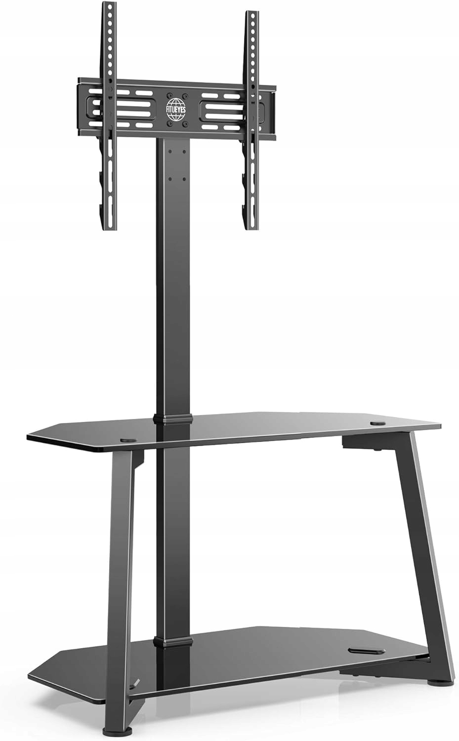 - Wspornikowy stojak na telewizor przyjmuje czarne półki ze szkła hartowanego i ukośną metalową ramę nośną w swoim designie, klasyczny i elegancki.