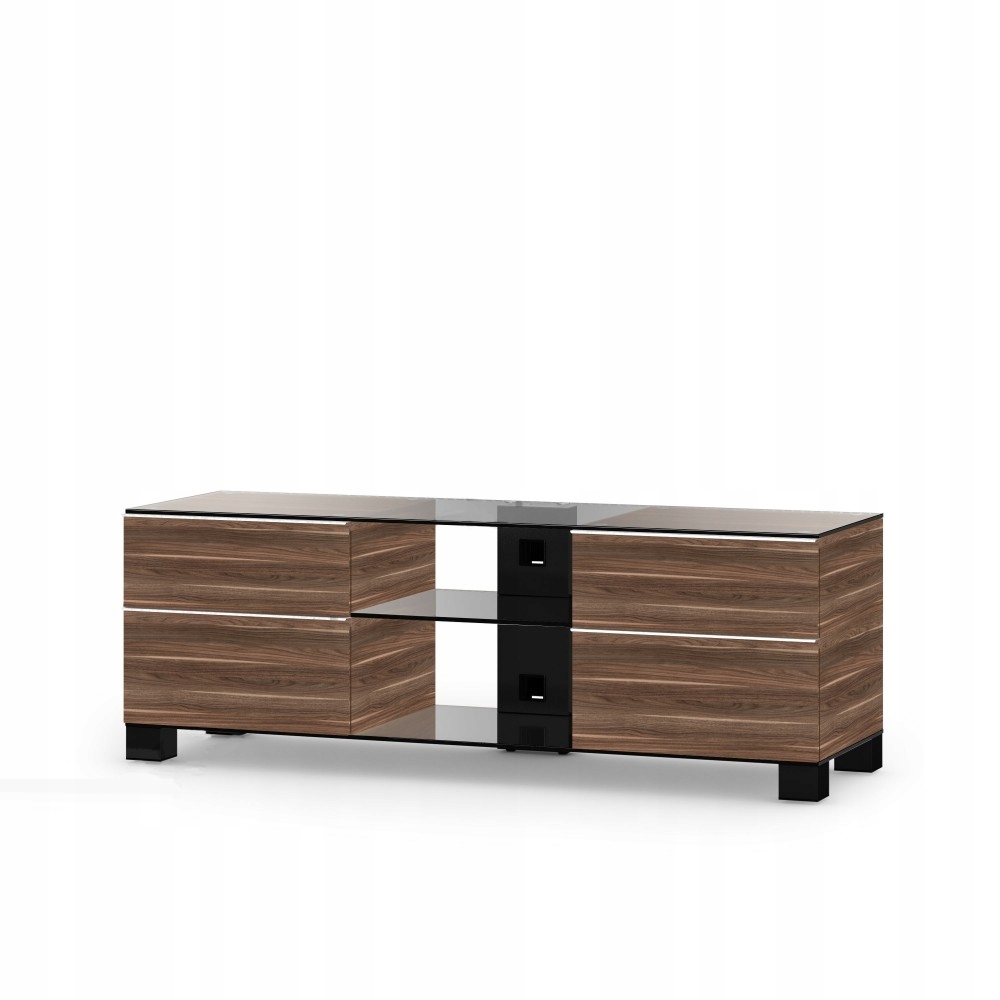 MD9340 WOOD Nowoczesny stolik na sprzęt audio-video. Wyposażony w dwie półki na sprzęt av, środkowa półka posiada regulację wysokości. Cztery zamykane szafki, jedna z nich wyposażona w organizer na płyty DVD. Górny blat przeznaczony na telewizora o przekątnej max. 60 cali. Wysuwana szuflada pomieści wszystkie piloty oraz drobne akcesoria av. Dwie boczne półki zapewniają dużo miejsca oraz odpowiednią wentylację dla umieszczonego w nich sprzętu audio. Szerokość stolika to 140 cm, obudowa wykończona drewnem naturalnym. Półki wykonane z hartowanego szkła z polerowanymi krawędziami dostępne w wersji przeźroczystej lub lakierowanej od spodu na czarno, co nadaje stolikowi elegancji i nowoczesnego stylu. Pozostałe elementy konstrukcji wykonane z aluminium o kształtach kwadratowych oraz prostokątnych, wykonanych w kolorze inox lub czarnym lakierze. Stolik wyposażony w kółka oraz system zarządzania kablami.