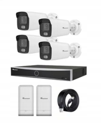 Zawartość zestawu: ✔ 4x kamera Vision Colour ✔ 1x rejestrator NVR (4-kanałowy, 2 TB) ✔ 2x most bezprzewodowy ✔ 7x kabel sieciowy