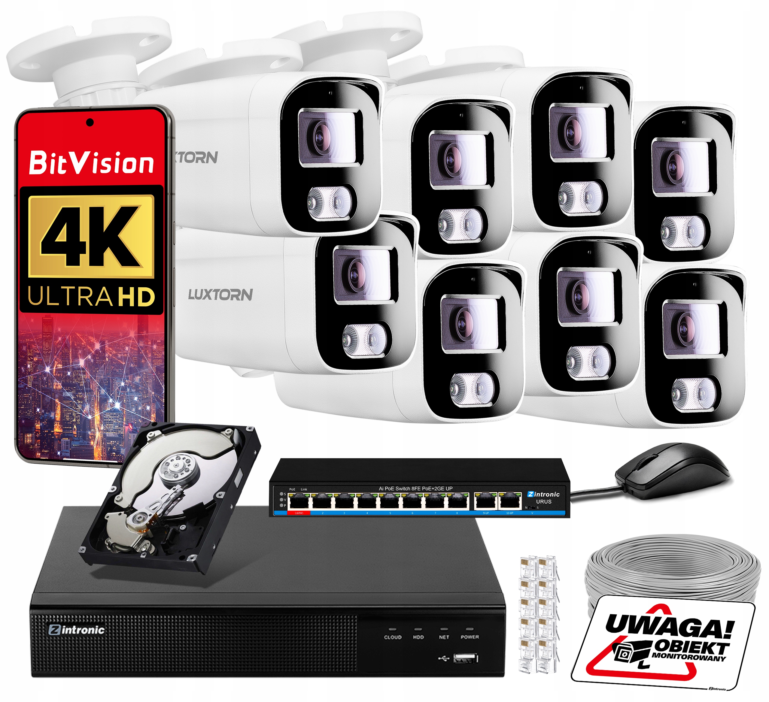 Zestaw 8 kamer Luxtorn 8MPx idealny do monitoringu domu, biura, magazynu, sklepu czy parkingu. Dzięki solidnej obudowie i odporności na warunki atmosferyczne kamery świetnie sprawdzą się zarówno wewnątrz, jak i na zewnątrz budynków. Prosty system wizyjny o doskonałej jakości obrazu zapewni możliwość kontroli obiektu i terenu wokół niego. A dzięki dedykowanej polskojęzycznej aplikacji BitVision – możesz mieć podgląd ze swoich kamer na żywo gdziekolwiek jesteś!