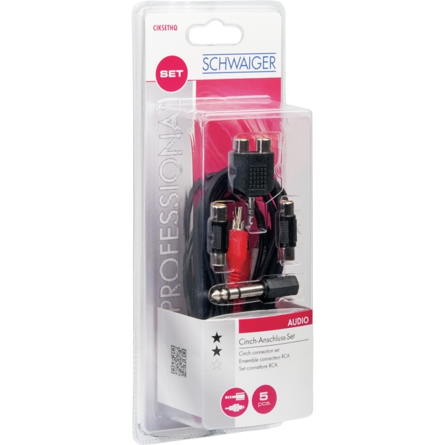Dzięki temu zestawowi połączeń audio SCHWAIGER® dostarczany jest niewielki pakiet z akcesoriami audio. Zestaw zawiera kabel połączeniowy CINCH, adapter audio, rozdzielacz audio oraz dwa złącza audio z najpopularniejszymi typami połączeń audio, jak wtyczka / gniazdo.