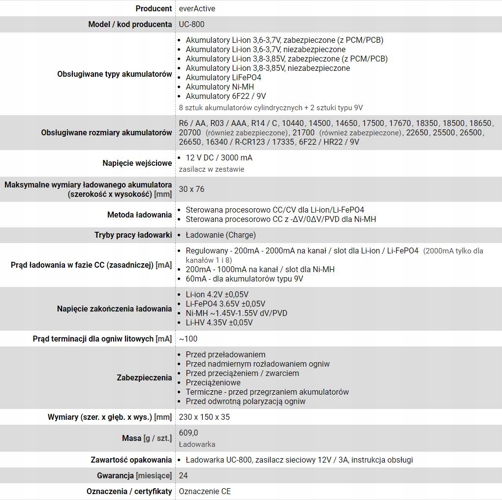 EVERACTIVE ŁADOWARKA DO AKUMULATORÓW CYLINDRYCZNYCH LI-ION ORAZ NI-MH UC800