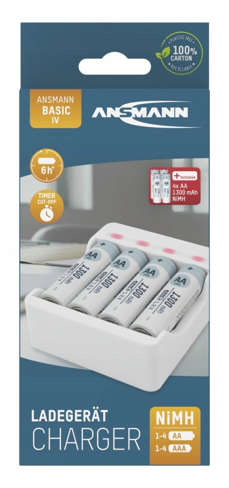 Ładowarka Basic IV to niezawodny ładowarka timer o doskonałym stosunku cena do wydajności. Dołączone są 4 akumulatory (AA/1300mAh) oraz kabel ładujący USB z przyłączem Micro-USB. Ładowarka wyposażona jest w wyświetlacz ładujący LED, mechaniczną ochronę polaryzacji i automatyczną adaptację prądu ładunku. ATCA / AAA / AAA NiMH można naładować. Dzięki temu ładowarka jest niedrogim punktem wejścia do gamy ładowarek ANSMANN i akumulatorów.