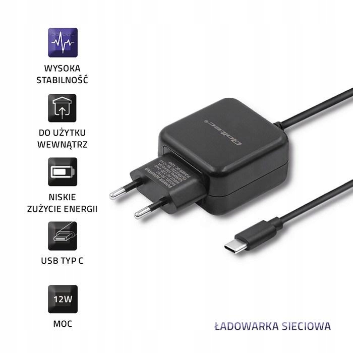 QOLTEC ŁADOWARKA SIECIOWA USB TYP C, 5V, 2.4A, 12W, CZARNA