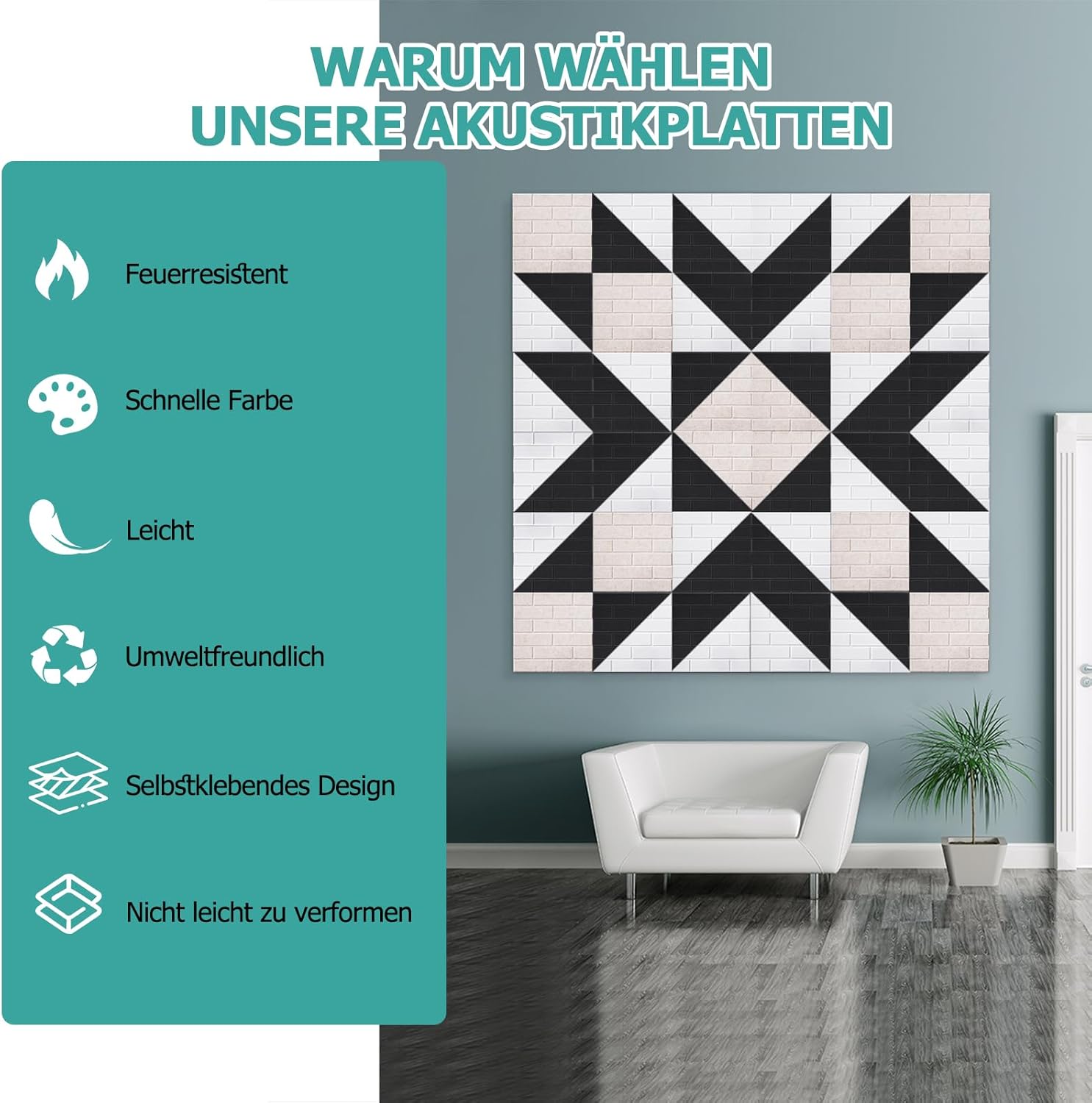 - • Bezpieczny materiał:• Wykonane w 100% z trwałego i lekkiego włókna poliestrowego.• Trudnopalne, odporne na odkształcenia i blaknięcie.• Przeszły uznany na całym świecie test formaldehydu ilac MRA.• Bezpieczne dla ludzi i zwierząt domowych.• Obróbka akustyczna:• Skutecznie redukują echo i pogłos w pomieszczeniach.• Poprawiają zrozumiałość mowy i redukują hałas w tle.• Efektywnie pochłaniają dźwięki o średniej i wysokiej częstotliwości.• Idealne do studiów nagraniowych, kin domowych, sal konferencyjnych i innych pomieszczeń.• Możliwość kreatywnej aranżacji:• Płyty akustyczne można przyciąć do dowolnego kształtu lub rozmiaru bez wpływu na ich wydajność.• Dostępne w różnych kolorach, umożliwiających kreatywne łączenie.• Ścięte krawędzie dodają trójwymiarowości i doskonale ozdabiają ściany, drzwi czy sufity.• Samoprzylepne wzornictwo:• Łatwe do zamocowania dzięki samoprzylepnej warstwie.• Wystarczy odkleić papier ochronny i przykleić do gładkiej, równej powierzchni.• Możliwość łatwego usunięcia paneli bez uszkodzenia ściany, używając suszarki do włosów.• Obszar pokrycia:• Rozmiar każdej płyty wynosi 30 x 30 cm.• Jedno opakowanie zawiera 12 sztuk, które pokrywają łączną powierzchnię 1,08 m².• Zaleca się zakup odpowiedniej ilości w zależności od potrzeb.