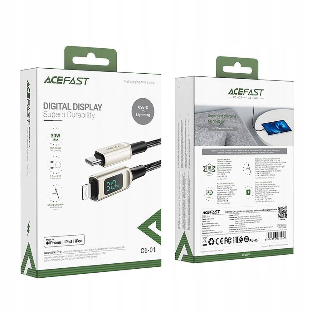 Kabel Acefast ze złączami USB-C—Lightning do ładowania i przesyłania danych, stworzony z myślą o urządzeniach Apple. Ma długość 120 cm i działa z prądem o natężeniu do 3 A oraz mocą PD 30 W. Posiada wyświetlacz LED i certyfikat MFI (Made For iPhone), dzięki czemu na smartfonie nie pojawi się komunikat o nieoryginalnym akcesorium.