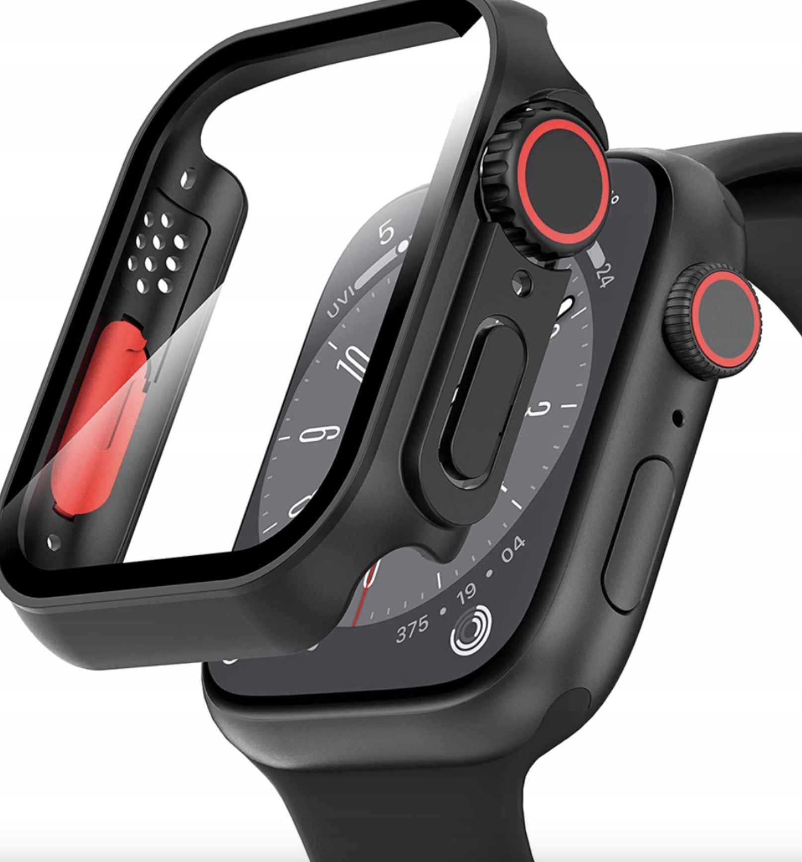 Czarne, wzmacniane etui z wbudowaną osłoną ekranu o twardości 9H, które chroni ekran Twojego smartwatcha Apple Watch przed zarysowaniami i innymi uszkodzeniami zewnętrznymi, nie tracąc przy tym jasności, przejrzystości i czułości. Specjalna powłoka oleofobowa zapobiega nadmiernemu pozostawianiu odcisków palców i plam oraz ułatwia czyszczenie. Przezroczyste osłona ekranu z czarną obudową smartwatcha.